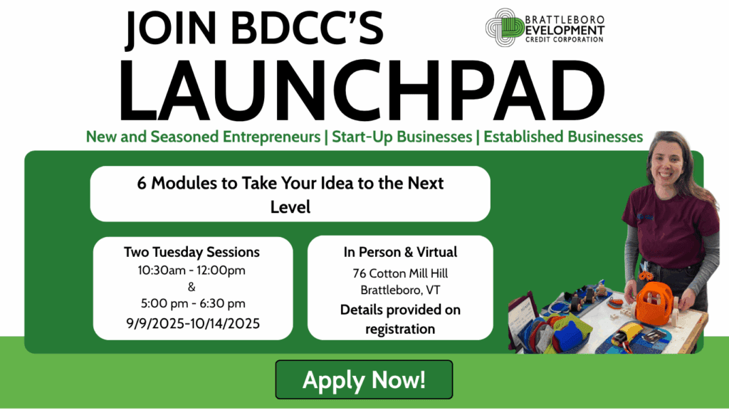 Securing financing can be a pivotal step in launching, growing, or stabilizing your business, but knowing where to start can feel overwhelming. At Brattleboro Development Credit Corporation (BDCC), we’re here to help demystify the process and set you up for success. Hosted by BDCC’s business service team, this free event is designed specifically to help […]