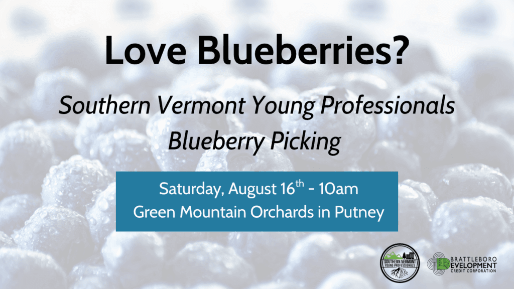 Join the Southern Vermont Young Professionals for a true summer pastime: blueberry picking! We’ll meet at Green Moutain Orchards in Putney. Optional yet encouraged, bring your favorite recipe to make with fresh blueberries!