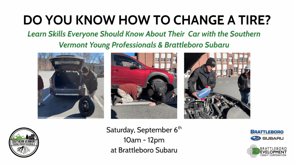 Back by popular demand! Join the Young Professionals for an opportunity to refresh your tire-changing skills. When was the last time you actually changed a tire? Has it been too long? Join the fun and practice with your peers! Experts from Brattleboro Subaru will be on hand to lead us through the process.