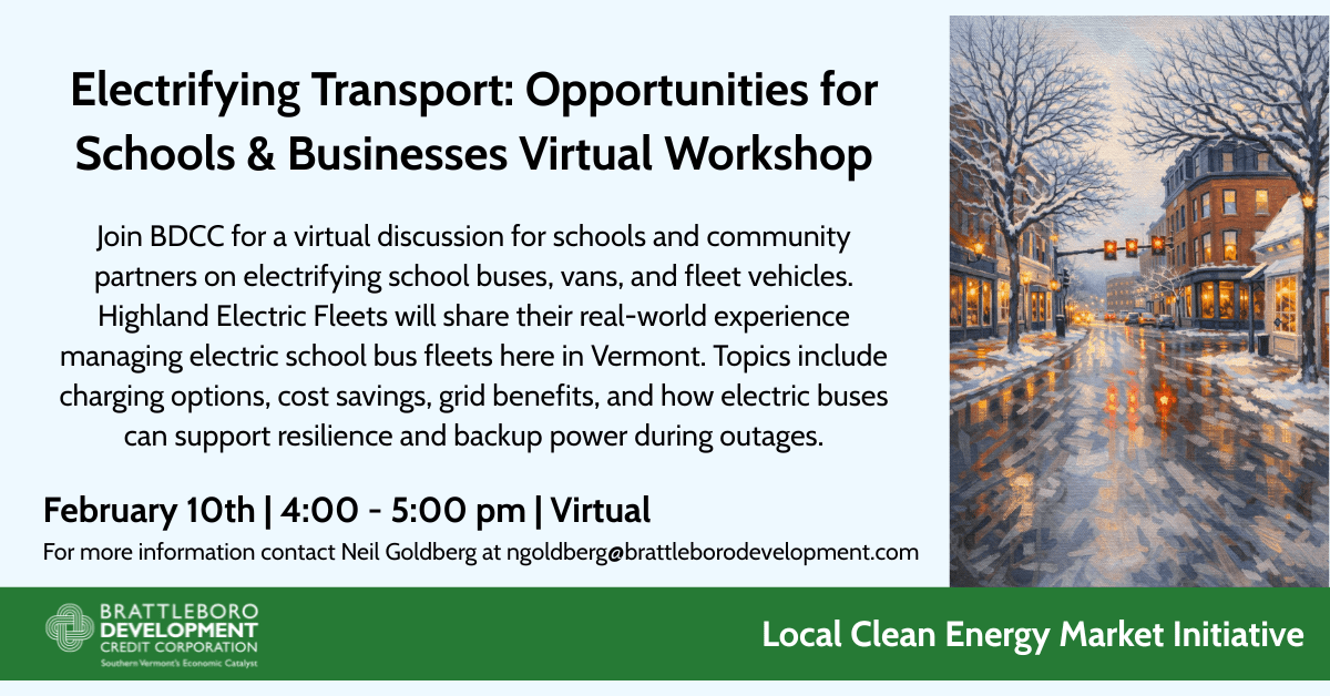Join BDCC for a virtual meeting on February 10th 4:00-5:00pm for schools and businesses in Brattleboro and Southern Vermont to discuss options and opportunities for the electrification of school buses, vans, and other fleet transportation. Representatives from Highland Electric Fleets (HEF) will join to discuss their work managing 1,000+ electric school buses across the US, including two fleets of electric buses that operate in Vermont at the South Burlington and Champlain Valley School Districts. Bi-directional vehicle-to-grid (V2G) charging and conventional EV charging options will be discussed, along with other cost-saving and resiliency opportunities.