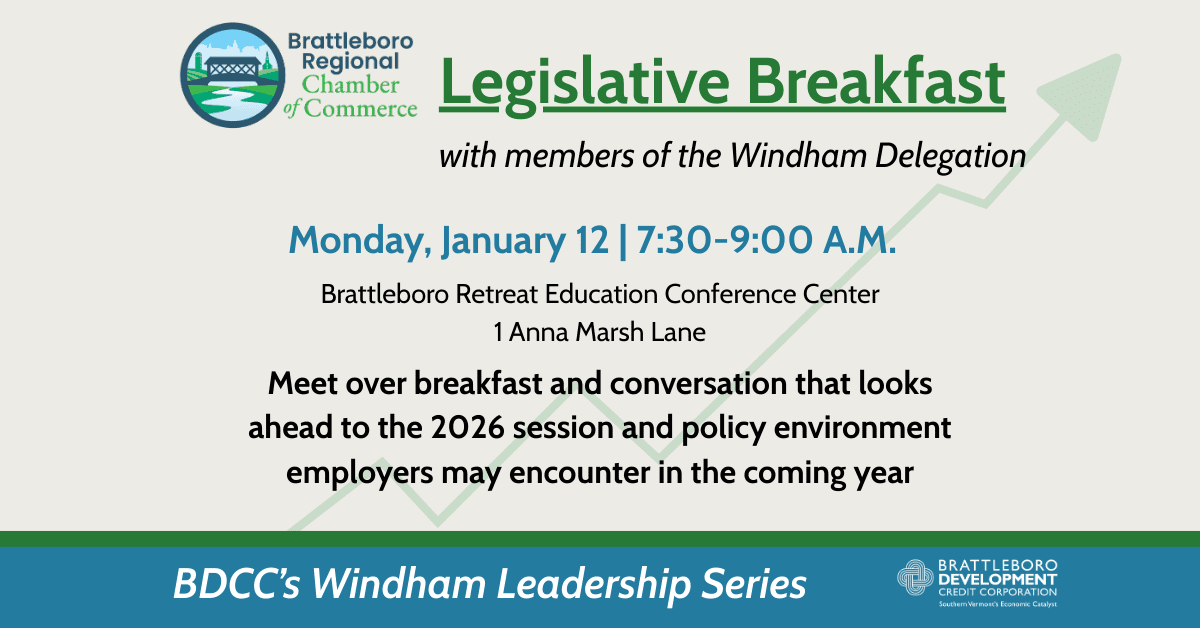 The Brattleboro Regional Chamber of Commerce will host its annual breakfast with Windham County legislators on Monday, January 12, 2026 in partnership with the Brattleboro Development Credit Corporation’s Windham Leadership Series.