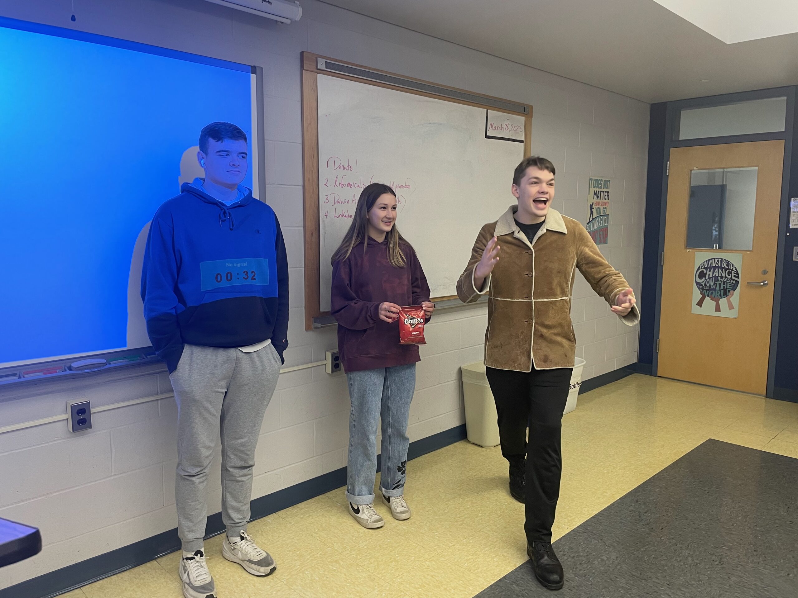 Many students felt challenged by the idea of self-promotion, or, as they referred to it, “humble bragging”. As a lesson in personal branding, students worked in teams to develop a unqiue product and learn how to market it through the creation of a slogan, logo, and jingle they incorporated into an old-school infomercial. Pictured below, pitch man Leo sells “Clean Clips,” an imaginary product used to keep those pesky Dorito spices off your fingers when you snack. The exercise helped students understand the importance of identifying and valuing their own strengths and build the confidence to “sell” those strengths to prospective employers or college recruiters.