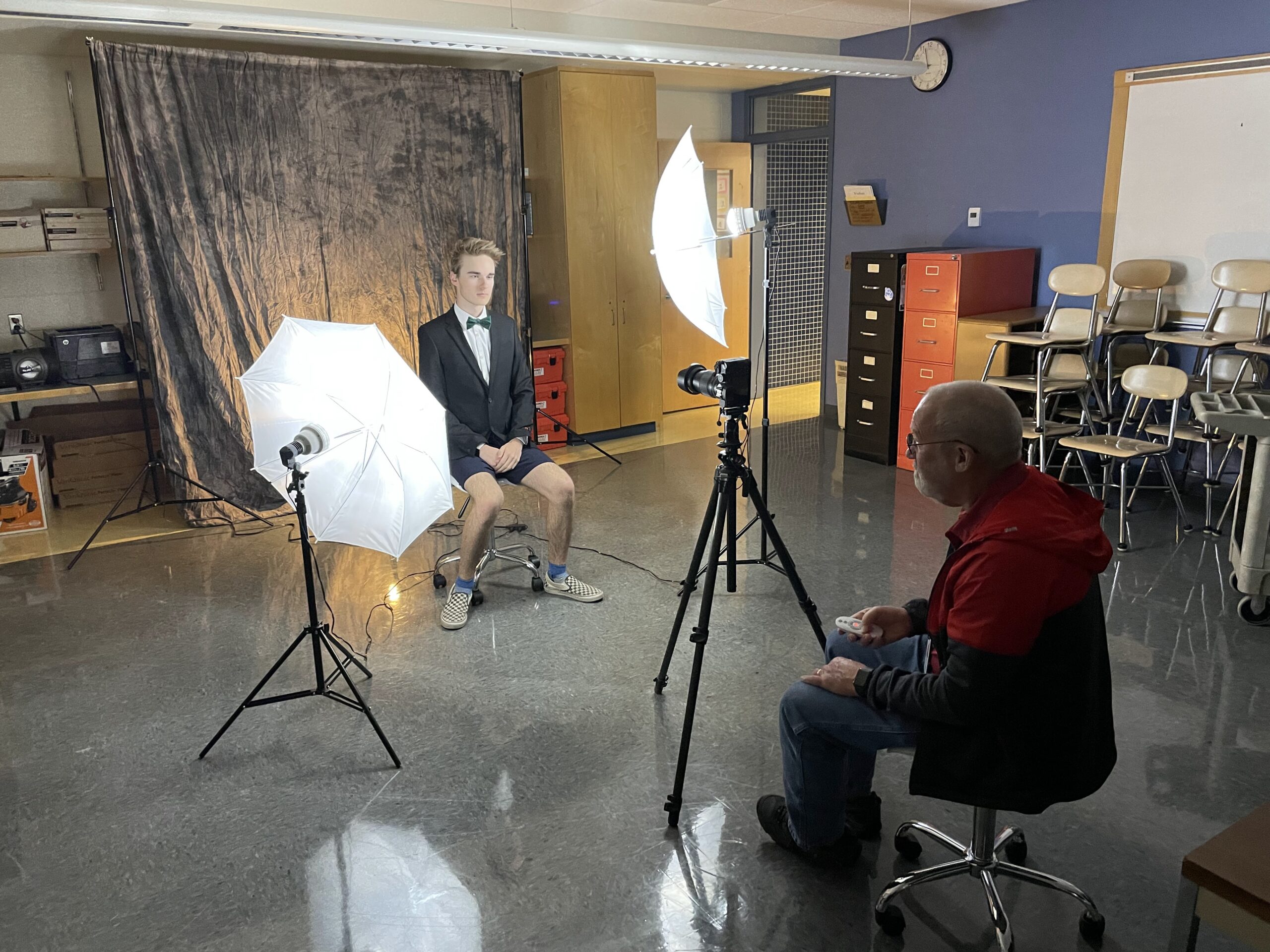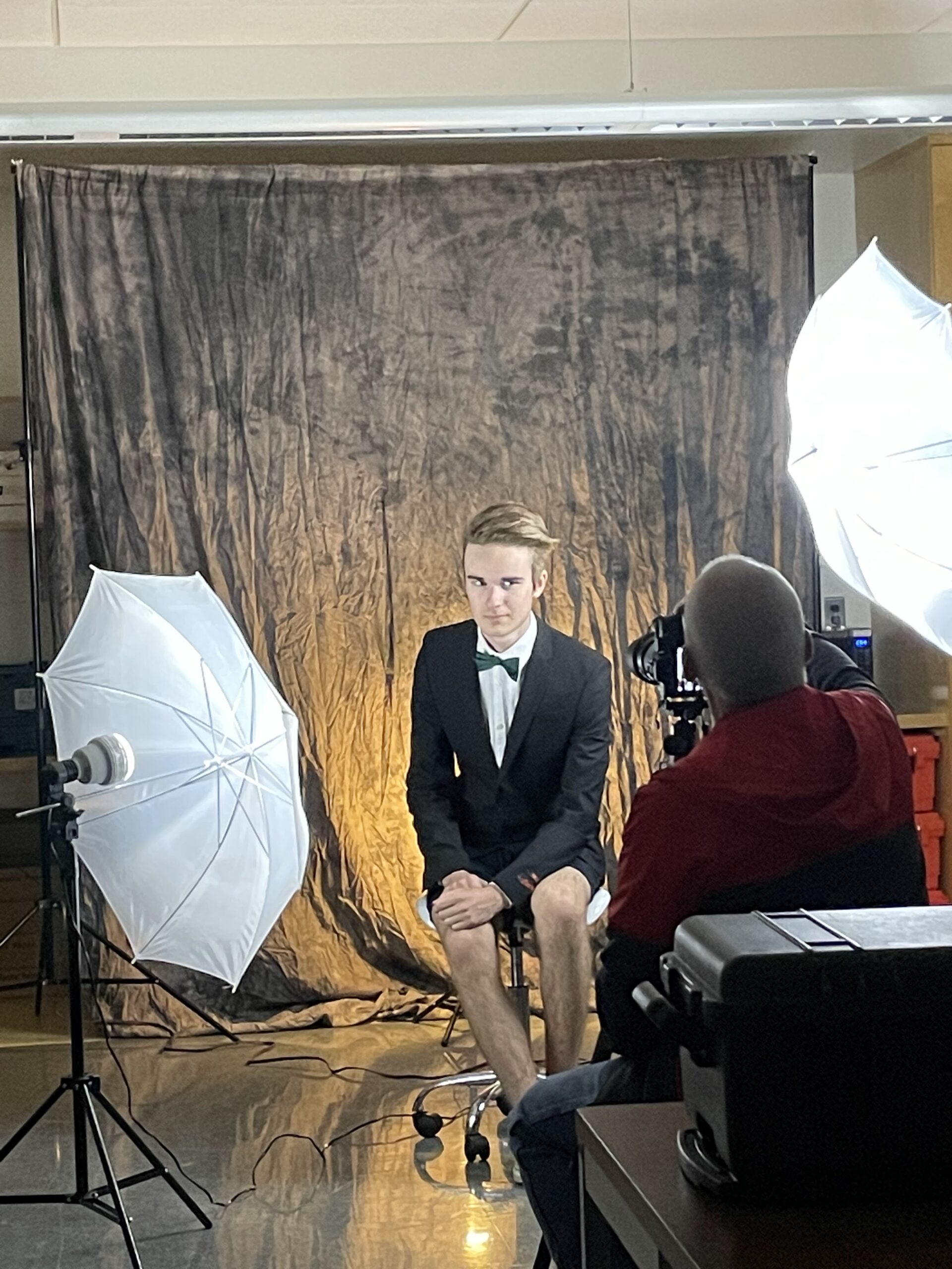 As an extension activity, students then transferred their resume content to Linkedin pages, creating distinct headlines and summaries similar to their product slogans and jingles. Each student also had the chance to sit for a professional photoshoot with local photographer, Bill Steele. Their headshots were uploaded to their Linkedin profiles like the eye catching logos they designed for their products. Below, Bill shoots River’s “James Bond” headshot.