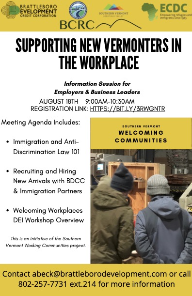 For additional information about hiring and supporting New Vermonters, you can watch this past meeting, or contact abeck@brattleborodevelopment.com.