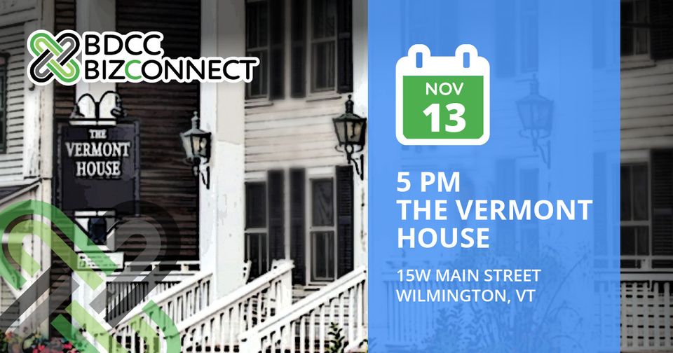 Building upon BDCC’s ongoing commitment to foster a vibrant entrepreneurial ecosystem, the program invites business owners and leaders to connect for the evening with drinks, light appetizers, and a big opportunity at The Vermont House, 15 W Main St, Wilmington, VT 05363 at 5:00 pm on November 13, 2024.