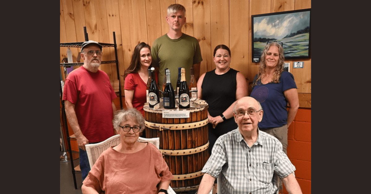 Photo: Kate and Charles Dodge, founders of Putney Mountain Winery, and the “Fermented Five” – the new employee-owners. From left, Richard Fairchild, Amber and Jason Hubner, Lauren Osowski, and Kim Wallace.