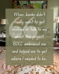 BDCC’s lending program assisted Lori on securing an SBA loan for renovations. BDCC staff provided technical assistance to support Lori through every step in the reopening process including setting up financial systems for her bookkeeping.