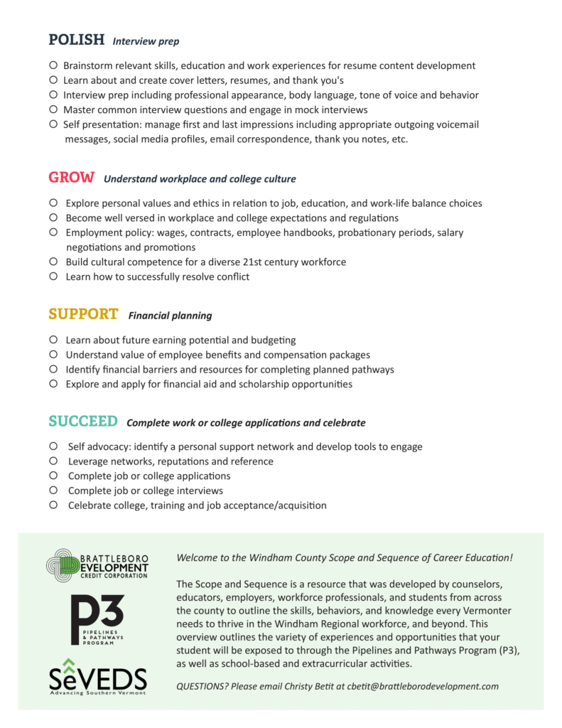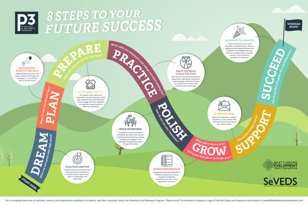 P3 is designed to leverage Vermont’s Act 77 and Flexible Pathways to better connect regional students with great career pathways. We work together with school faculty, supporting and strengthening career education and preparation, connections with real professionals and work experience, as well as training and education opportunities. Our goal is for every student in Windham County to access to high-wage, high growth careers in their own communities. To do this, students need to finish high school with a plan and the skills to achieve their personal goals.