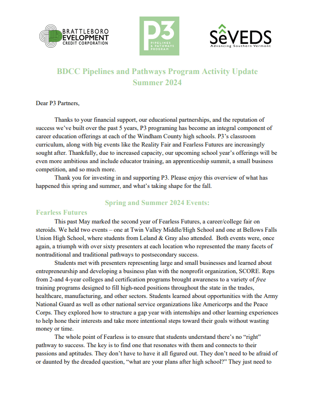 P3 was originally launched as a five year pilot, thanks to historic investment from the Vermont Community Foundation and McClure Foundation, the Vermont Training Program, WCEDP Vermont Yankee closure funds, and municipal contributions to SeVEDS. In 2023, at the end of that pilot phase, P3 reached a major program milestone by commitments from the private sector. M&T Bank, whose support was matched by local employers G.S. Precision and C&S Wholesale Grocers joins funding partners McClure Foundation, the George W. Mergens Foundation, the Windham Regional Career Center, the West River Education District, and the Windham Southwest Supervisory Union, in supporting P3 across southeastern Vermont. Portions of the program also receive support through the Workforce Opportunity for Rural Communities (WORC) program of the Northern Border Regional Commission.