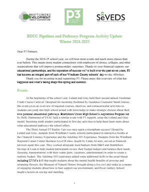 The Pipelines & Pathways Program is designed to help Vermont students successfully prepare for and access employment opportunities. The program began as BDCC’s Workforce Center of Excellence “Fast Tracks to Success” program working with high school students, and has grown from field trips and the annual Sophomore Summit, into a program with year-round classes, events, professional connections and faculty partnerships in every Windham County high school. In the 2025-6 school year, P3 served over 1,100 students and engaged over a hundred volunteers, organizations, colleges and businesses.