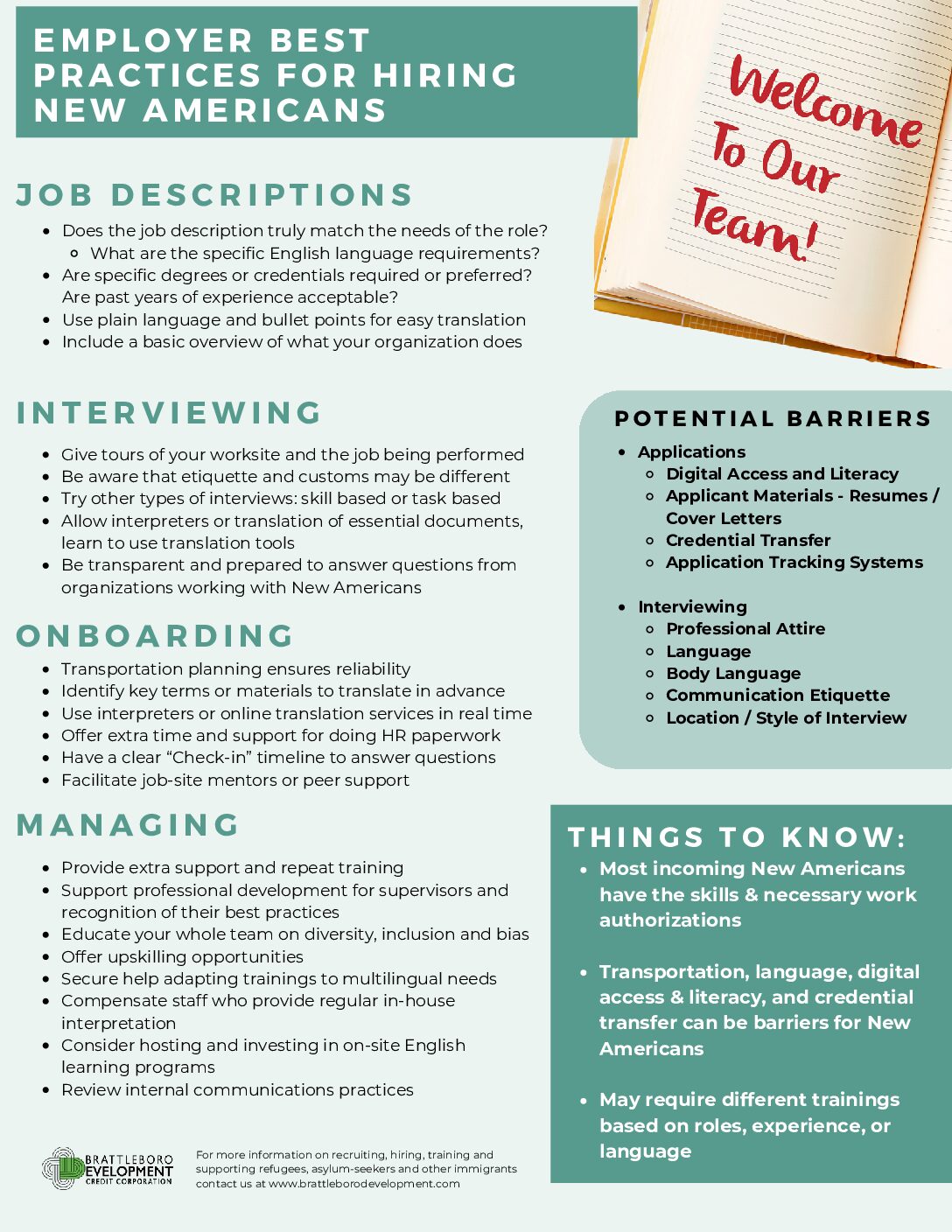 In addition to the long-term systems building for SoVermont, BDCC is providing Windham specific leadership in helping employers prepare their operations to be Welcoming Workplaces. BDCC is gathering resources and leaders experienced in creating educational materials to assist employers ready their existing workforce to work alongside individuals for whom English a not their primary language, to learn about and explore their known or unknown biases to ensure each and every employer in Windham Region is welcoming.